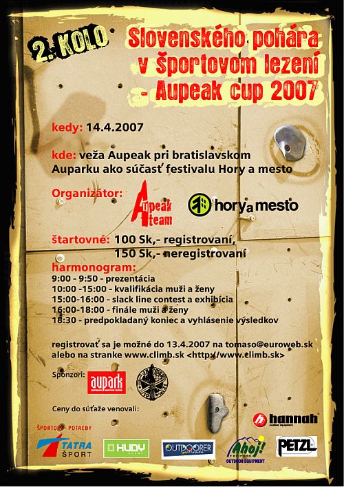 smPozvánka na závody Slovenského poháru v lezení na obtížnost v Bratislavě v Auparku na stěně Aupeak v sobotu 14. 4. 2007. Závody jsou zařazeny do programu horolezeckého filmového festivalu Hory a město.