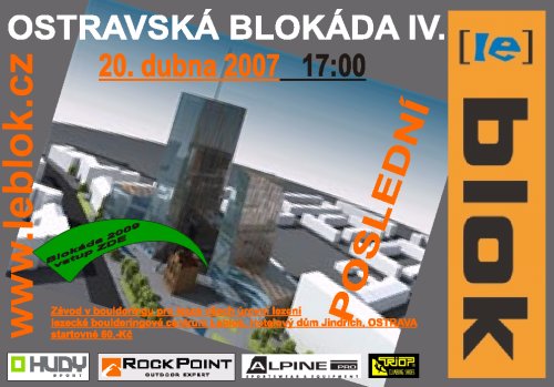 Dovolujeme si pozvat všechny příznivce tohoto malého závodu na jeho, na delší dobu, poslední kolo.Takže symbolicky 13. 4. tedy v pátek opět v 17.00 se těšíme na hojnou účast. Systém závodu bude trošku jiný (nechejte se překvapit) a pozváni jsou stavěči bouldrů na všech zatím proběhnuvších Blokádách. Neváhejte tedy s účastí bude to stát za TO!!! Více na www.leblok.cz