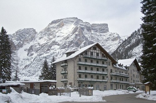 U Hotelu Pragser Wildsee, poblíž stejnojmenného jezera, je placené parkoviště, mimo sezónu však také mimo provoz. Všude je cca. 30cm sněhu. Vydáváme se cestou č. 14, která z levé strany kopíruje tvar jezera a místy nabírá podle skal i výšku kolem 50 metrů nad vodou.