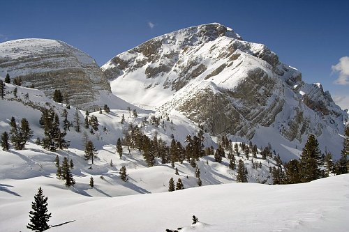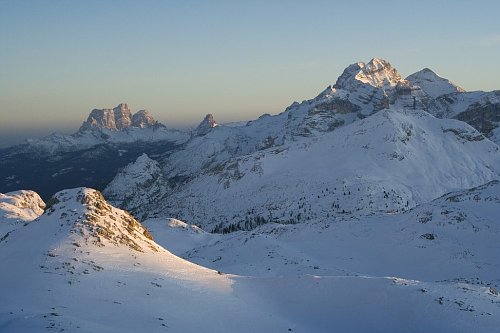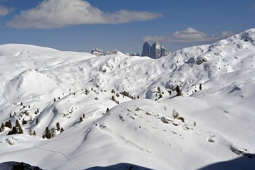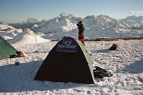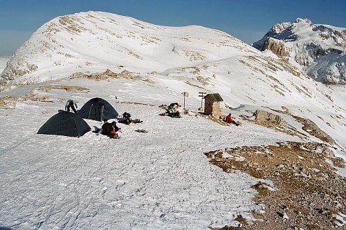 Po rozjímání z opravdu skvělého výhledu např. na Monte Pelmo, Tofany, Cristallo a Le Ödle se pouštíme do stavby stanů a budování base campu. Chata Seekofelhütte je pod námi a v tuto roční dobu zcela opuštěná. Ze sedla je vynikající pohled na začátek velmi strmého hřebene Croda del Becco. V noci se ovšem počasí rapidně zhorší, zvedne se silný vítr a začne sněžit. Jeden stan neudrží "letní" kotvení a musíme ho před odchodem na výstup položit na zem. Krystalky zmrzlého sněhu bičují tváře, při výstupu velmi strmým ( 40° ) jihovýchodním hřebenem. Obzvláště první pasáž asi 150 výškových metrů ve vás nechá pocit, že byť v mačkách, tak nemůžete slézt. Až po začátek řetězů je jako podklad zmrzlý firn. Stoupací železa jsou tedy nezbytnou nutností. Za řetězy se pro změnu propadáme do asi 30 - 40 cm prašanu a takto, již mírně, postupujeme až k vrcholu. Cesta je jednoznačná a spíše z levé strany kopíruje hranu hřebene. Na vrchol docházíme po dvou hodinách dřiny. Je zde asi 5 metrový kříž a jindy asi i výborný výhled. Sestup vede stejnou cestou a trvá přibližně hodinu do výchozího sedla.