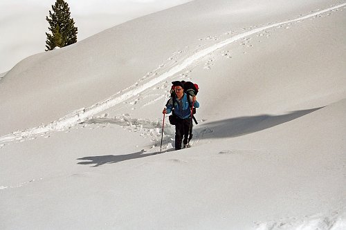 Vis on je ten problem ze chuze ve stope po skialpech ti nepomuze ai na sneznicich a uz vubec ti nepomuze stopa od lyzi v botach. Nejen ze se bris, ale navioc se prolamujes krustou stopy.