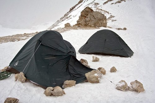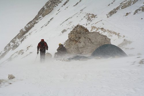 Zpevňujeme ležící stan a stavíme v sněhové futeři ohrady z okolí nasbíraných a vykopaných kamenů. Pokoušeli jsme se ještě o dosažení vrcholu Rote Wand jihovýchodně od base campu, ale špatná viditelnost spolu s mlhou zabránili jeho dosažení. Šlo to jen po Ofen Mauer a sedlo Cocodain Scharte. Do rána vítr neustával, naopak přibylo hustější sněžení. Za svitu čelovek sestupujeme ve 4 hodiny ráno stejnou cestou zpět. Jen přes jezero se již dáváme rovnou. Po 3 hodinách sestupu už ohříváme zmrzlý motor naší Cordoby a pelášíme domů.