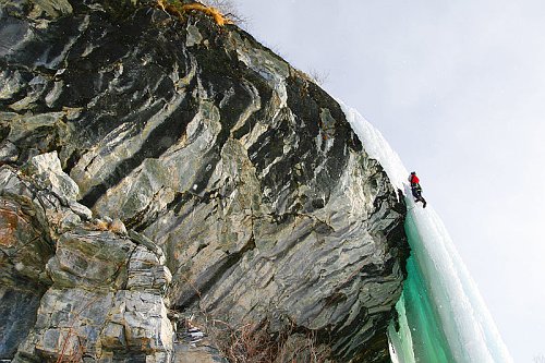 Na samém konci kotle v úzkém žlábku najdete světovou klasiku. Nástup je z komína (někdy mixový začátek). Lez co můžeš po tenkém ledu až ke štandu pod velkou střechou. Doprava. Zajisti se dvěma frendy. Pouze několik akrobatických kroků a budeš v dobrým ledu ...seriózní lezení. První pilíř obvykle dvakrát do roka upadne. Šťastný let! Cesta z roku 1995.