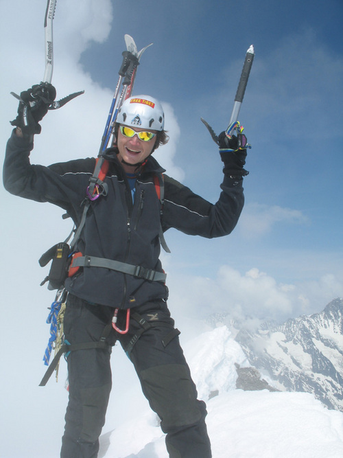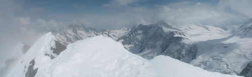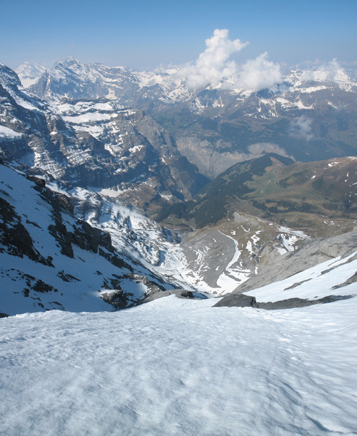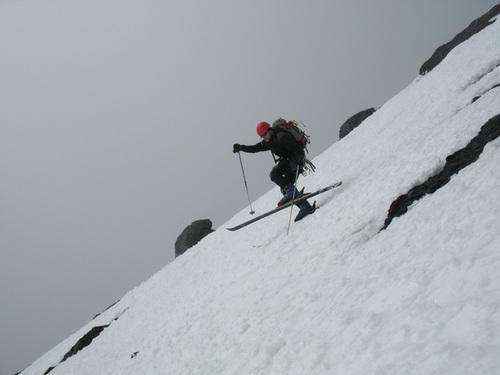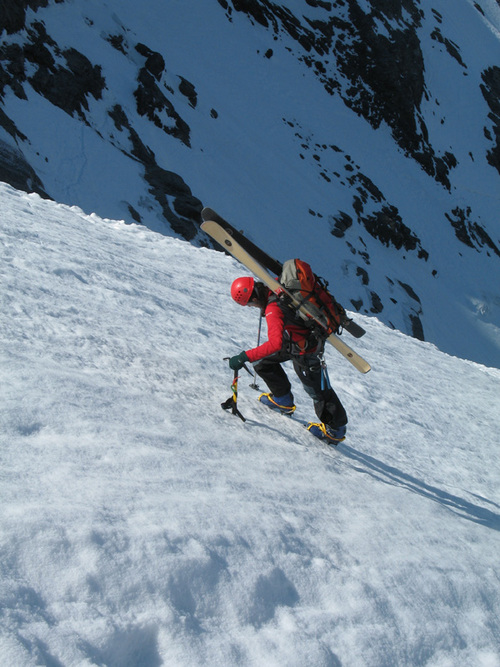 Nástup je prakticky hned u kolejí, sníh je zmrzlý a na mačkách jdeme i na naše poměry poměrně rychle a tak se za necelé dvě hodiny dostáváme k prvnímu klíčovému místu cesty, k ledovcovému zlomu s obrovskými seraky, které se nám naštěstí rychle daří obejít. Následuje prudký, ale stabilní široký žlab, po kterém stoupáme směrem k sedlu, abychom pak odbočili na závěrečný, asi 600 v.m. vysoký vrcholový úsek, který je poměrně málo vysněžený, takže není jednoduché volit stopu tak, abychom byli stále na sněhu.