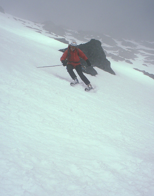 Konečně chvíli trocha modré oblohy, zkouším první oblouky na samotné vrcholové hraně, která je poměrně vzdušná. Sníh je však výborný, nahoře stále prachový a utemovaný, takže všechno krásně drží, což člověku přidá víc na jistotě. Přeci jen se mi moc nechce proletět se celou severní stěnou až dolů, jak to předvedl v jednom filmu freeridový guru Heli Putz na stejném místě, ovšem s basejumpovým padákem. Marek mne střídá na konci hrany, kde se pouštíme do vrcholové stěnky, která může mít v horní partii necelých 50°, zbytek je taková poctivá 45°. Sníh je hodně rozměklý, odpolední sluníčko nám provádí skvělou práci, tak si můžeme naplno vychutnávat čím dál delší a delší oblouky. Intervaly na zastavování se prodlužují, ale přeci jen 1600 v.m. dolů je pořádná porce na nohy, které mají co dělat, aby všechno ustály. Závěrečný úsek pod seraky jedeme hodně svižně, aby ze shora něco nepřilétlo. Za necelé dvě hodiny jsme dole, vyčerpaní, ale šťastní, neboť podle předpovědi to měl být na dlouhou dobu poslední pěkný den, což jsme si ostatně měli možnost vyzkoušet i na vlastní kůži v dalších dvou týdnech putování Alpami. To že nám ujel poslední vlak, s tím jsem trochu počítal. To, že cesta po kolejích bude trvat čtyři hodiny k autu, s tím už trochu ne, ale o to delší a spontánnější byla oslava, která ostatně na cestě už samovolně začala dvěma litránky bílého, ukrytého na horší časy v tunelu (počítali jsme, že nám ujede vlak...).