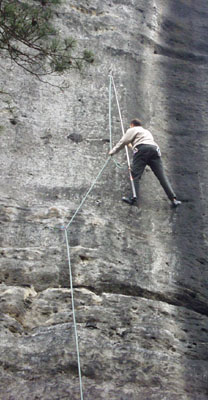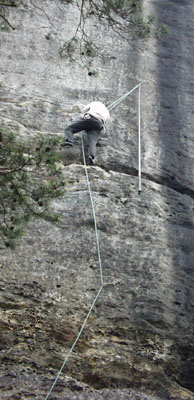 Na víkend byla Předpověď počasí děsivá, nicméně vyrazili jsme do Žlebu. V noci na sobotu už nepadla ani kapka a celou sobotu bylo docela "slušně". Ale mokro trochu bylo. Že se tedy podíváme do Schmilky. Po dohadování z celníkem kolik máme EUro a kam jedem a co tam budem dělat, jsme nechali auto hned za celnicí.  To už se trousili Sasíci s lanama do skal. Když jsme došli k Turm am Verborgenen Horn zůstali jsme čumět. Poprvé jsem to viděl ve Smith Rocku. Tam místní používaj šáhla dlouho, ale na písku to jsem ještě neviděl. Jak to funguje. Na skládací rybářskej prut navážeš  expreso a pohodlně od kruhu ke kruhu jenom nahazuješ jištění s lanem.