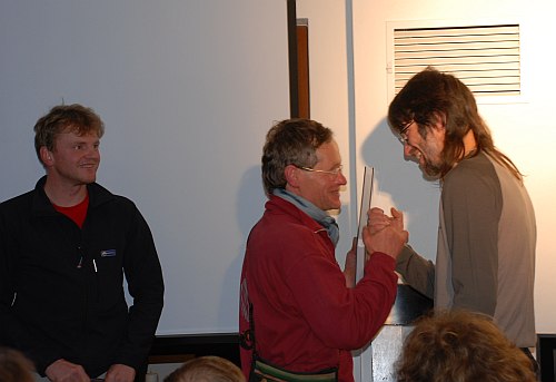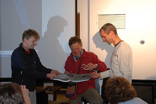 Pak došlo k předávání knih zasloužilým. O její vznik se kromě Jardy a Žofína zasloužila i parta lezců zvučných jmen: Prcas, Pavouk, Mára Holeček, Jehla, Piškot atd. a do výčtu jsme se vmáčkli i my editoři lezce Hopík, já a Standa, v což jsme sice tajně doufali, ale netroufali jsme to vyslovit nahlas. Když nám pak byla kniha předána samotným Arnoldem, spolu s opravdu srdečným stiskem ruky, blížila se naše euforie nirváně.