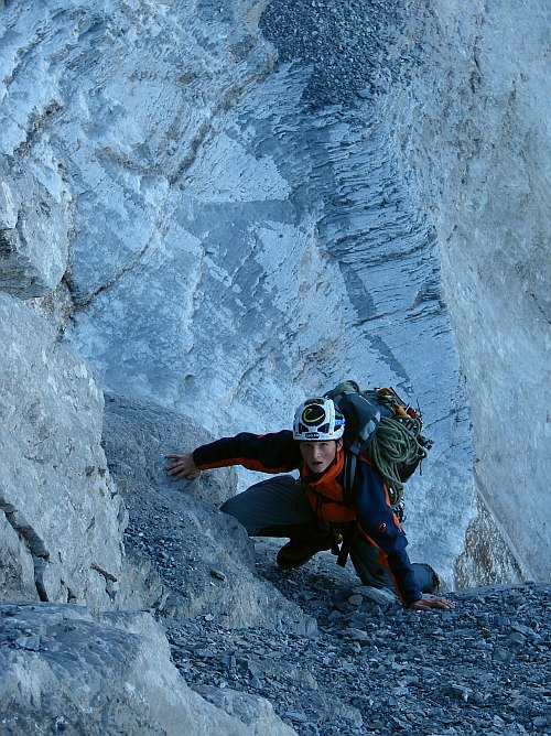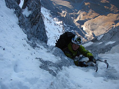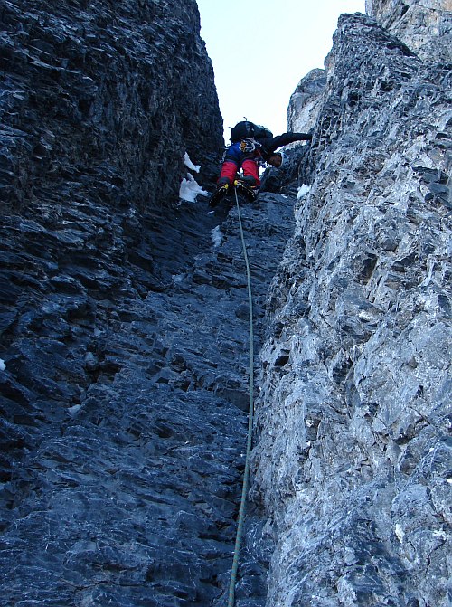 Čekalo nás ještě přelézt Ausstiegsrisse několik prvních délek bylo opět mixových a ty nás zavedly do posledního problému – asi pětkového komínu s trochou sněhu ledu a skály a nakonec jsem se dostali přes několik skalních pasáží, kde lezení nebylo těžké, ale skála měla naprosto hroznou kvalitu a tak jištění bylo spíše symbolické.