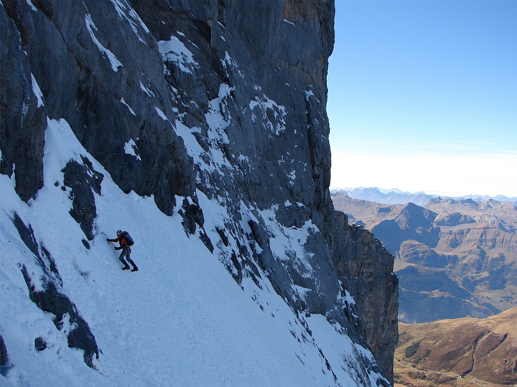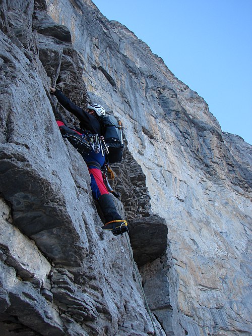 Pak jsem dorazili, po několika mixových délkách, do Hinterstoisser Quergang což je takový mixový travers ve stěně , kde naleznete taky fixní lana, uchycení lan i lana samotná se zdála v pořádku ale stejně jim člověk nemůže zcela důvěřovat, proto že neví, zda lano nebylo třeba poškozena naseknutím ostrým padajícím kamenem.