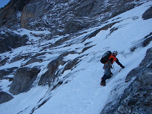 Zde jsme se odvázali a přelezli tuto pasáž sólo neboť to, vzhledem ke špatnému jištění byla asi ta nejrychlejší a nejbezpečnější varianta průstupu v tomto strmém firnu.