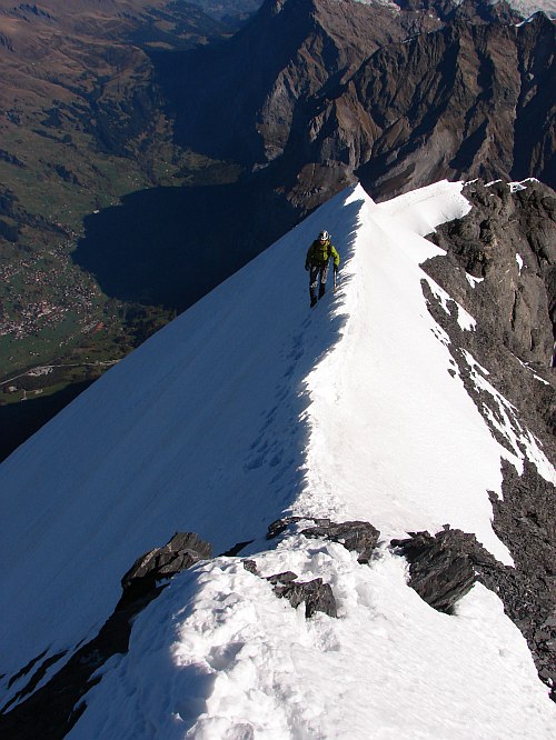 Abychom se dostali do výlezového sněhového pole Ausstiegseisfeld kde jsme se už samou radostí odvázali z lan a vystoupili až na hřeben Mittellegigrat.