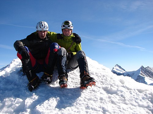 Hned potom jsme pokračovali a překonávali postupně sněhová pole se sklonem mezi 50° až 60° což nám šlo celkem rychle a tak jsme se brzy dostali do tzv. Eisschlauch - nejtěžší zledovatělé pasáže, která dosahuje sklonu až 75°, najdete zde docela dost tenký led, ale nám se podařilo bez úhony tuto pasáž překonat a navíc celkem rychle a tak jsme asi za půl hodiny stáli pod druhým sněhovým polem, také se sklonem kolem 50° až 60°.