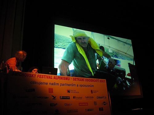 Ladislav Jirásko (uprostřed), strůjce Smíchovského festivalu v debatě s další legendou tentokrát českého horolezectví Voloďou Suchým (v kroužku napravo), který naučil lézt celé generace. A jak mi Voloďa řekl, ve svých 83 letech ještě stále občas leze