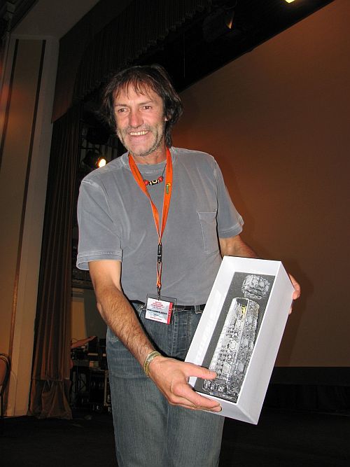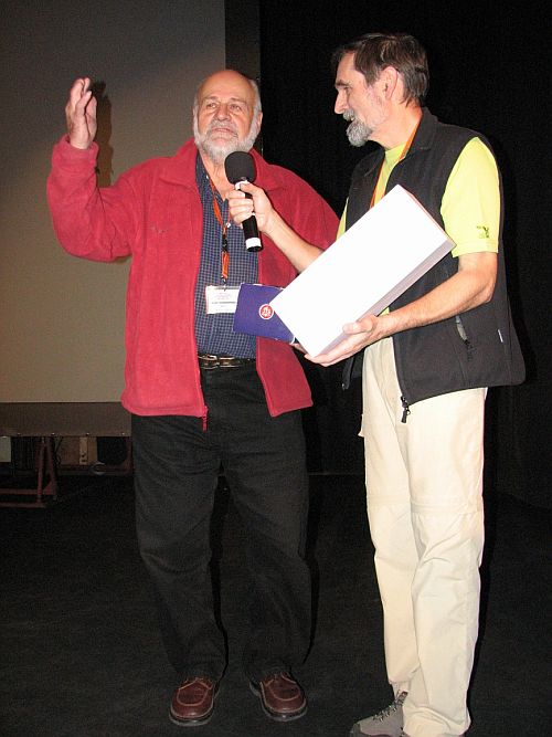 Cenu za nejlepší přednášku neděle přebírá od prezidenta akce Ladislava Jirásko legenda Kurt Diemberger