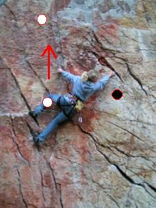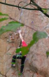 Pak následovalo přidání borháku do naší cesty Jojo (foto). Samozřejmě opět bez jakéhokoliv souhlasu. Lucka leze Jojo (foto viz níže). Přidáním borháku došlo ke změně obtížnosti nejtěžšího místa. Originální borhák má ještě nad sebou.A kdopak nám to tam vrtá? Podle pravidel, kterými se Petr ohání, nemá jištění nových variant ovlivňovat starší cesty!!! Děkujeme přátelům za zaslání fota.