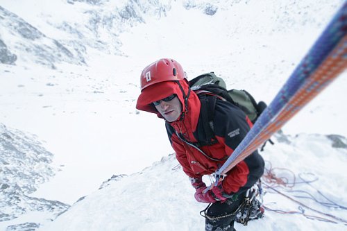 Cestou zapadáme místy až po pás. Jinak to jde. Honza si nasazuje čepici a přetahuje kapuci. Navrch ještě přidal helmu. Je to paráda. Takže ne jenom, že nevidí, on i neslyší. V první délce jsem zjistil, že to takhle nejde. Nevidět a ještě neslyšet. Honza cepíny buší do šutru jako vzteklý havíř.I práce s dvěma lany je náročnější. Nejhorší však asi bylo vlastní lezení s cepíny a mačkami. Bez citu a vizuální kontroly je takřka nemožné pro Honzu lézt skalnější partie. Ty partie bez pověstných tatranských drnů. Délku pod lávkou Szepanských jsme se otočili do doliny. Slanili jsme.