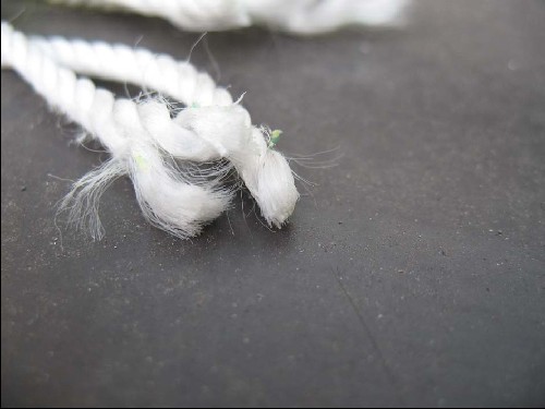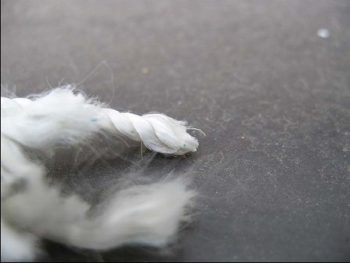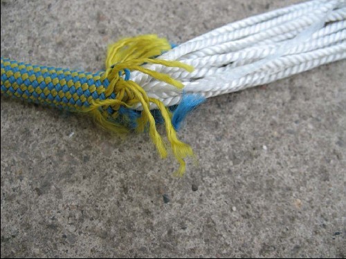 Detail přeseknutého lana, charakteristické střižení vláken do jedné roviny.