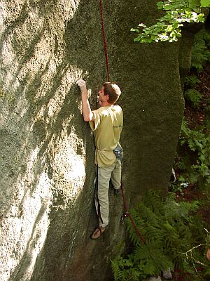 Velryba to je klasika. Zkoušeli jsme Tučný rybí traverz 7A, ale kolikrát jsme ani nenastoupili. Jen Azbest v něm vytrvale cupital tak deset minut a když už byl z nejhoršího venku a zbejval mu lehký výlez, šmejkla mu noha a bylo po srandě. Pak jsme ještě chvíli skákali z výlezu v boulderu Vedle hrany 7A a potom nás konečně Vlasta dostal na svojí Pofiderii.