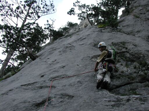 No ale dorazili. Ráno obloha nic moc, ale šlo se lézt. Já s Martinem máme pohodový plán na celý den, cestu Himmelsleiter 7- RP. Dvanáct dýlek lezení v nepříliš exponované stěně. Přesto to bylo docela pěkný. Tůmojc se Šéďou a Tomem zalezli na Stadlwand do cesty Richterweg 5- RP.
