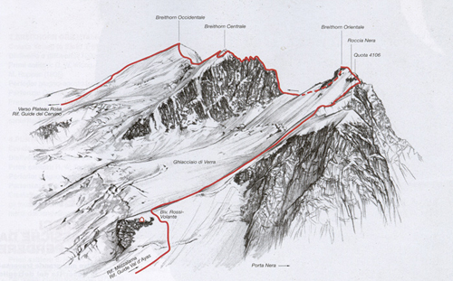 Kompletní traverz Breithornu, u nás málo známá perlička (kresba Marco Camandona)