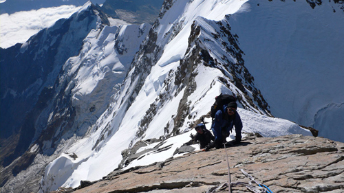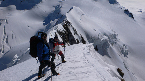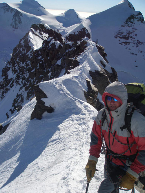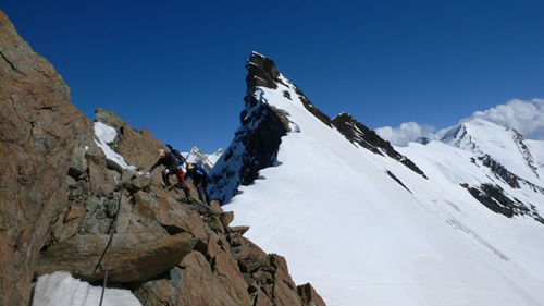 Skalní či mixové pasáže zase nejsou takový problém, tak maximálné do III. Největší problém je právě ta exponovanost jednotlivých hřebínků. Nejtěžší asi byl z Zumsteinspitze na Dufour, který byl nejen velmi uzoučký, ale především hodně strmý a sestup po něm dolů byl opravdu výživný :-)