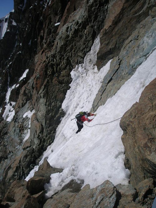 A v tomto případě jsme opravdu přilby neměli, mnohem potřebnější byly proti sluníčku čepice či Vlastův slamák :-))) Měli jsme jen 40 m dlouhé jednoduché lano, žádný friendy či skoby, žádný humpolácký cepíny, ... Asi nejvíc potřebný byly kvalitní mačky se supr protisněhovými "balónky" od Grivelů a hůlky :-))) Já měl u sebe na sedáku 5 karabin se zámkem, 1 ks expresky, 2 ks vývrtek, sadu prusíků na ledovec a 2 ks sešitých smyček. Jako jednu z dalších nejdůležitějších pomůcek bych tady chtěl ještě zdůraznit GPSku s perfektně nacvakanou trasou a s ústupovými variantami ...