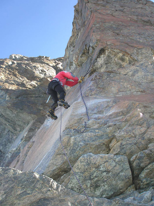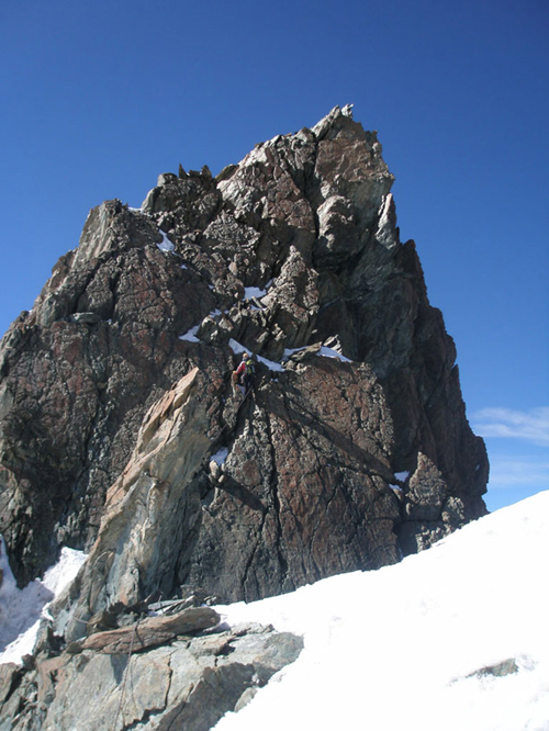 Výstup na Dufourspitze: lezení po plotnách ale v pevné skále ve výšce okolo 4 600 m!!!