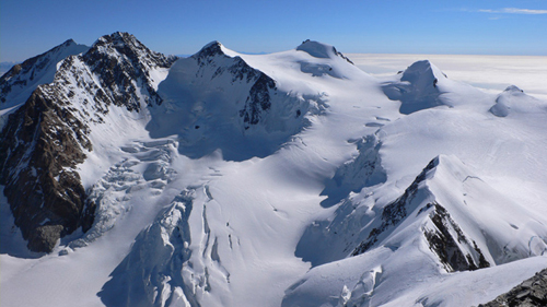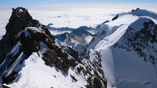 Pohled z vrcholu Dufourspitze směrem na nejvýše položenou chatu v Alpách Regina Margherita, všimněte si strmého sněhového hřebínku z Zumstenspitze, to je nej nej místo celého traverzu