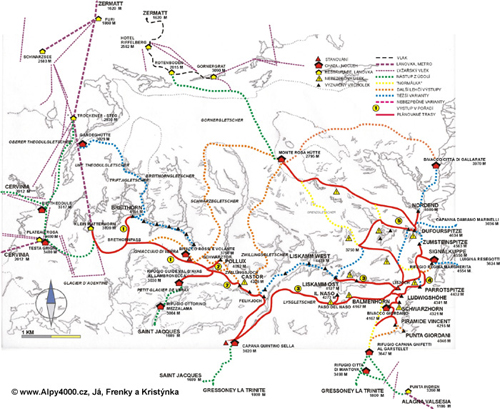 A kde se Vám tohle může přihodit? Jedná se o několikadenní túru ve výšce nad 4000 m nad mořem. Jedná se o přechod hlavního hřebene mezi Matterhornem a Monte Rosou. Jedná se o výlet v nejcentrálnějším centru Alp, ve Wallisu. V celém tomto úžasném hřebenu se nachází 18 čtyřtisícových vrcholů (19 včetně Matterhornu). Cesty k nim se vyznačují především dech beroucími úzkými hřebínky a velmi vysokou nadmořskou výškou ...