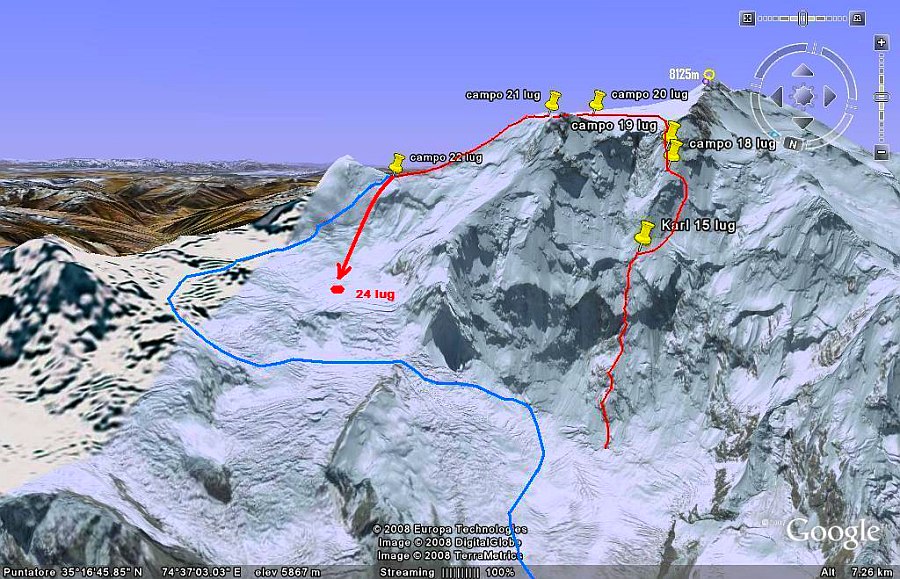 Nedeľa 20. 7.  – Konečne sa podarilo Nonesovi a Kehrerovi skontaktovať sa s base campom. Obaja sú v poriadku a v celkom dobrej pohode aby všetky možnosti zvážili. Dosiahli pozíciu odkiaľ môžu štartovať zostup zjazdom na lyžiach (tie majú zo sebou vo výbave tiež) cez Buhlovu cestu 1953. Ďalší deň sa o to pokúsia.