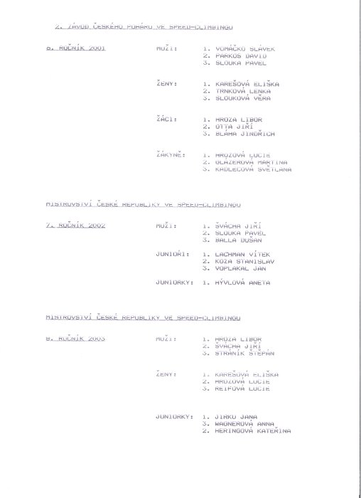 Jednoho akurátního zimního večera jsme se u pivča nebo kofoly domluvili, že závod v lezení na rychlost uděláme i letos. V loni se závod povedl, po tolika letech od posledního závodu byl počet účastníků celého víkendu uspokojivý. Počasí ušlo a tak jsme v pohodě sledovali závodníky při jejich výstupech. Loňský nejrychlejší čas Libora Hrozy byl 24 vteřin (23:92), letos budou trasy obdobné. Zatím potvrdili účast např. Hrozovi, Sandokan, Gábina a Dominik, kteří závodili loni. Stěna je trošku vyšší než bývá zvykem, jeden kolmý převis, ale palce budeme držet všem. V neděli je připravený závod pro veřejnost, každý může přijít kdykoliv během dne a odzávodit si svojí kategorii a poté se věnovat jiným sportům či třeba skalám.