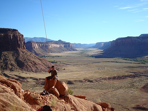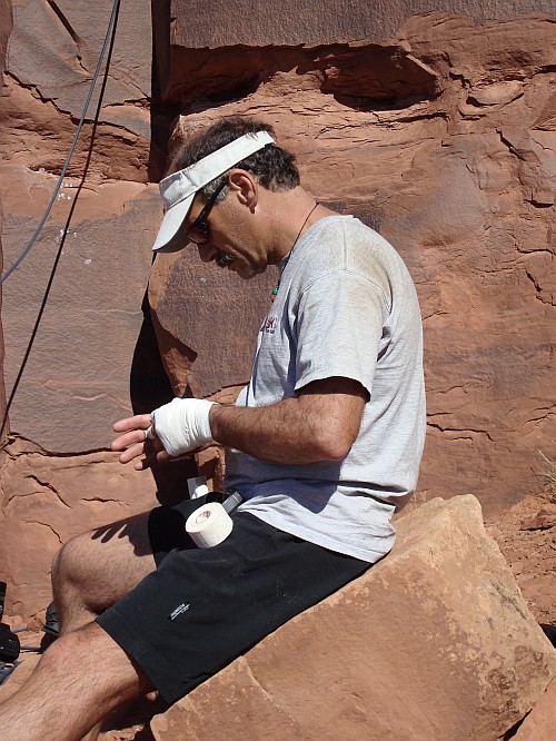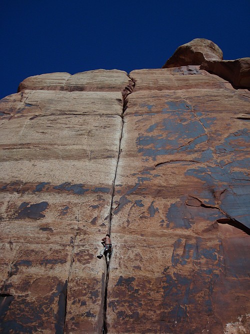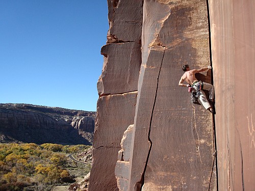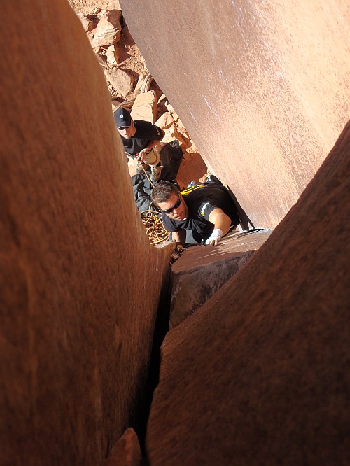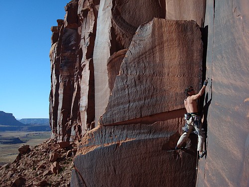 Dave vypadá jako úplně normalní usměvavý amík, avšak podle toho, co o něm psali v American Alpine journalu, zas tak úplně normalní není. Za pár hodin dojíždíme do Moabu, což je poslední větší město před Indian Creekem. Dokupujeme tejpku, trochu jídla a hlavně vodu. Za další hodinku přijíždíme do Indian Creeku. Před námi se rozevírá údolí lemované po obou stranách rudými masivy. Nekonečné množství spár, koutů, sokolů, komínů a širočin většinou přísně rovnoběžné. Lezou se většinou jen první délky od 20 do 70 metrů. Zcela zvlaštní kapitolou jsou pouštní věže, které nabízejí odpovědi na základní otázky typu: jsem opravdu horolezec? Umím vůbec lézt? Bojím se výšek? Chci tohle vůbec někdy dělat?