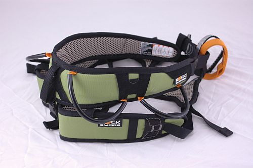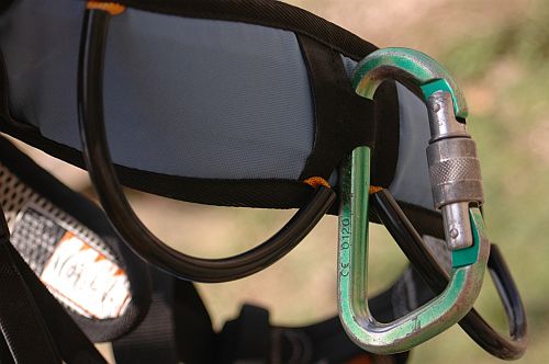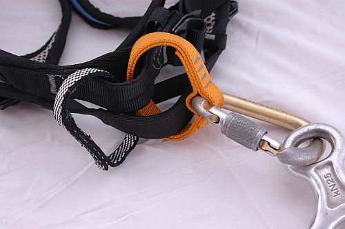 Při bližším ohledání hlavního jistícího oka si všimnete, že je zde speciálním vedením při šití vytvořeno (nabráním smyčky), ještě malé očko, které je určené pro vložení jistící karabiny, která je tak trochu fixovaná v jedné poloze a nemůže se volně protáčet. To zabraňuje například tomu, aby se karabina stočila a byla zatěžována v příčném směru.