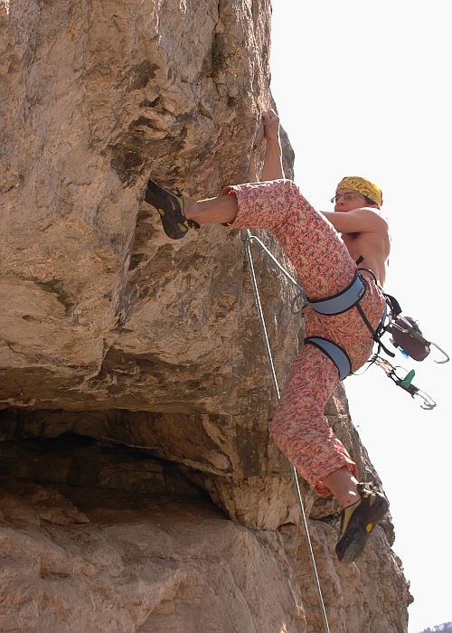 I když asi šroubovací karabiny jsou testovány a splňují limity i pro síly napříč podélnou osou, zdálo se nám, že mít karabinu vsazenou v tomto oku přináší příjemnější pocit při jištění, jako že máte větší kontrolu, když je při podávání /dobírání eliminován ten volný pohyb karabiny v oku.