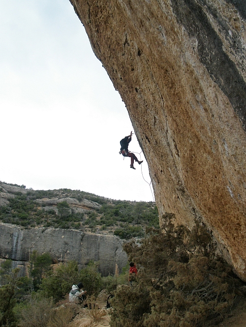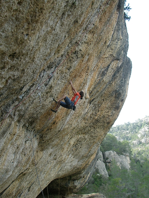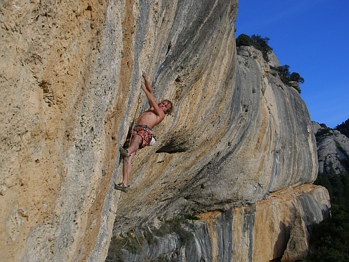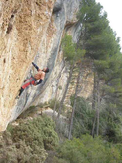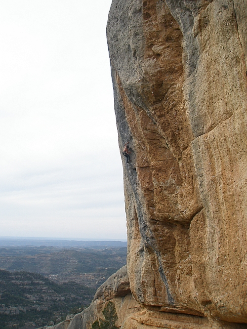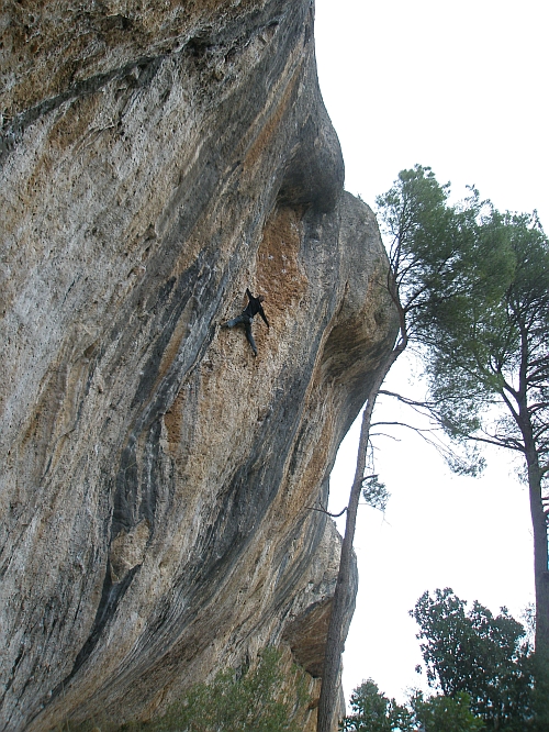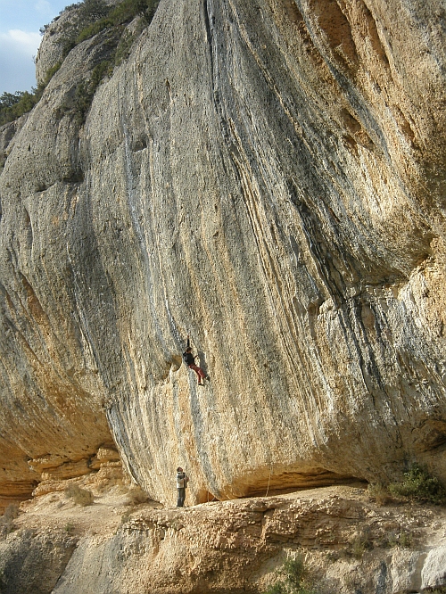 Cabernet: Vzdušné a dlouhé lezení nad kostelíkem Sant Salvador s pěkným výhledem do krajiny. Těžiště obtíšnosti kolem 7b.
