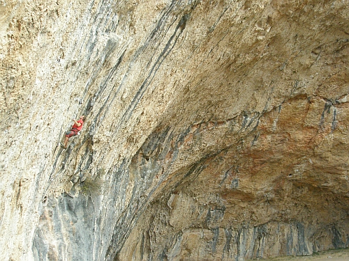 Cargols a la Carera 7a velmi převislý sokolík v pravé části jeskyně s nepříjemným bouldrem na konci, velmi tvrdé seznámení s oblastí