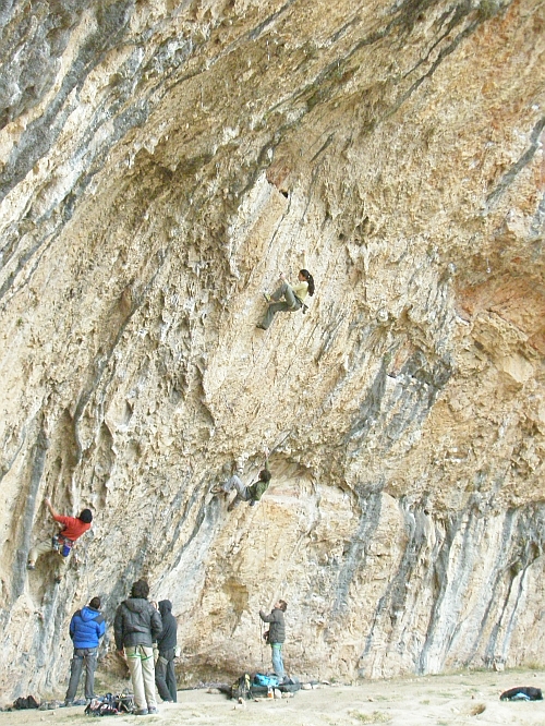 10. duben: Azbest se v předpovědi nespletl, chčije jako sviňa, jedeme na svaté místo všech lezců, do Santa Linye. Ano, všichni svatí trpěli, trpíme i my. Santa Linya je asi svaté místo všech sebemrskačů, všichni jen sedí, funí, padají, řvou. Pak přijel Bůh a dělal to samé, akorát v projektu za 9b.