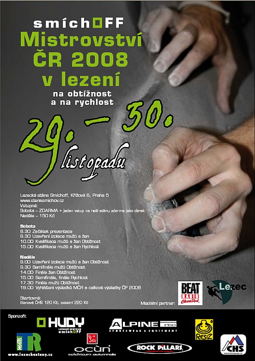 Rád bych připomněl, že se nám rychle blíží MČR 2008. Jak se již poslední tři roky stalo tradicí, proběhne nejdůležitější závod sezóny v Lezeckém centru Hudy smíchOFF v Praze, a to ve dnech 29. – 30.11.2008.