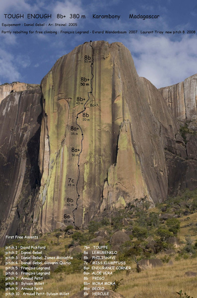 smNejtěžší  bigwall na Madagaskaru a určitě i jedna z nejtěžších vícedélkových cest světa nese název „Tough Enough“ 8b+ (380m). Nachází se v oblasti Tsaranoro, ve skalním masívu Karambony a na volném přelezu se podíleli lezci zvučných jmen, jako je Francoise Legrand, Stéphanie Bodet, Sylvain Millet, Laurent Triay a Arnaud Petit.