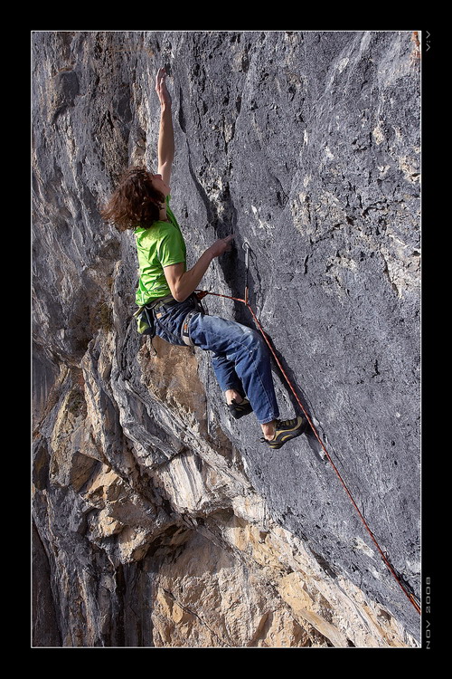 Následuje asi hodinová pauza, ve které se s Bokulou snažíme najít přístup ke slaňáku. Ferátkou se dostáváme nad “Růži“ (Weisse Rose), od které je kýžený řetěz ještě asi 8m vpravo. Adrelaninový traverz v teniskách a s veškerou výbavou, po kterém zpoceni konečně cvakáme fix. Bokula sjíždí dolů a já si připravuji fidlátka na následující Adamovy pokusy. Kdo ví, kolik jich bude a tak se snažím již z prvního ostrého udělat ty nejlepší záběry.