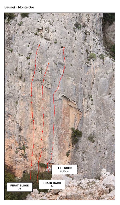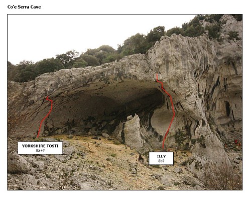 Další návštěva už byla v již zmíněné jeskyni C´e serra. Tato jeskyně je asi 800 m.n.m a jen ve stínu, tak jsme doufali, že bude suchá. Vymysleli jsme další reálný a rychle udělatelný směr (byla tam se mnou i moje žena s tříletou holčičkou a teploměr ukazoval něco okolo 10 stupňů). Vznikla cesta ILLY klasifikaci odhaduji po zkrokování jako 8b. Začalo pršet a  tak jsme hledali další možné směry. Našli jsme krásnou na slunce otočenou 35m dlouhou lehce převislou stěnu na Monte Oro. Tam jsme vynýtovali 3 cesty - FIRST BLOOD, 7a , TRAIN HARD,  8aFEEL GOOD, 6C/C+.