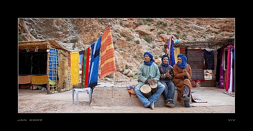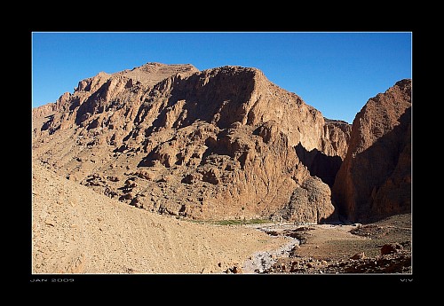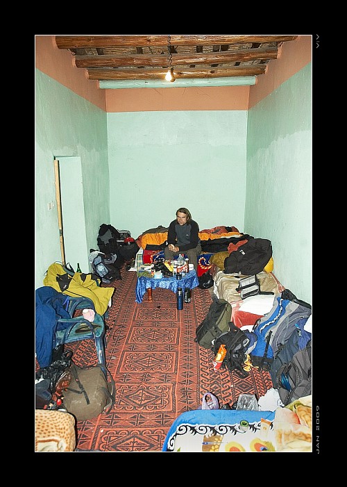 Z předchozí zkušenosti vím, že je dobré přijet na autobusové nádraží brzy ráno, abychom stihli devítihodinovou štreku autobusem do Tinerhiru ještě za světla. Horský pas ve výšce asi 2260 m n. m. je snadno průjezdný a nic nenasvědčuje tomu, že je polovina prosince a tudíž by i „měla být zima“! Jedna noc v malém městečku, kde ráno nakoupíme zásoby a už se cpeme do starého taxíku i s velkými batohy. Posledních 12km a jsme na místě! Před námi známé a usměvavé tváře majitelů hotýlku Riad Toudra a cena za noc dokonce nižší než kdysi, nám připravují příjemné přivítání. Po zabydlení se v hotelovém pokojíku, který bude na dalších 20 nocí naší základnou, jsme na lezení po dvou dnech cestování docela natěšeni. S ostatními se vydáváme soutěskou Todra do lehkých rozlezových  ploten a do kolmých technických stěn na Jardin d’Ete. Cestou pokukujeme po možných směrech pro naše hrátky s vrtačkou. Po rozlezení se poprvé vysápeme do protějšího svahu k sektoru Elephant, kde už začínáme zjišťovat, že formu bude potřeba „doladit“ a zvyknout si i na místní vápno. K večeru se nám podaří „naprogramovat“ jedno 7b+ a následně jej, jak praví moudrý Oliváč, pošleme do deníku:) Na první den to nebylo zlé....