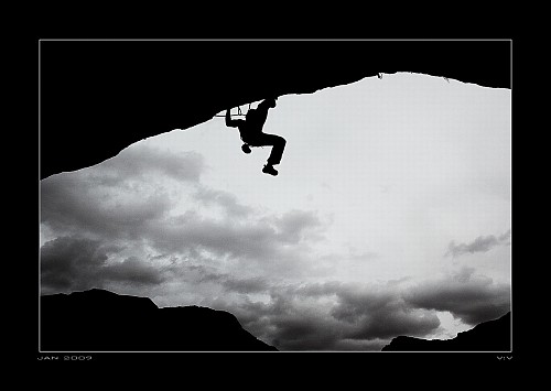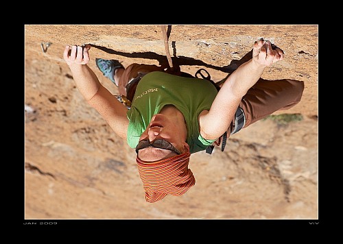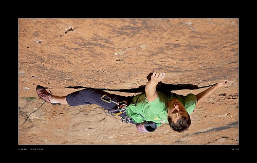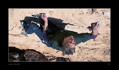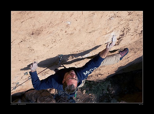 Druhý den ráno jsme naprosto rozbití. Na lezení to dnes OPRAVDU nevypadá a tak nabalíme s Vojťákem vrtačku, akumulátory, dvě desítky nejtů a nezbytné proprietky a vyrážíme k našemu předem vyhlídnutému kameni, kde se v následujících hodinách pokusíme ukojit naše prvovýstupovské choutky. K našemu nepříjemnému překvapení jsou již nejlehčí směry v plotně obsazeny a tak nám nezbývá, než se zahledět do mírně převislé oranžové trojúhelníkové stěny, kterou jsme nazvali Orange Triangle. Jejím prostředkem se nám matně rýsuje „lajna“, která by mohla být i lezitelná. První nýt osazujeme z předskalí, druhý z malého stopperu, který drží jen strachy v mikrotrhlince. Podobným způsobem, kdy se občas setkáme tváří v tvář s vytrženým fifi háčkem či skyhookem se propracováváme stěnou vzhůru. Na polici štand už je oproti předchozí dřině jen rutinní desetiminutová práce. Při prvním proslanění cesty je nám jasné, že to asi odhadnuté 7c nebude. Nu což, ocelový kartáč marocké výroby do „goldnčekehende“ (Vojťákova oblíbená fráze) a už se nám zpoza špinavé skály rýsují první chyty....tedy, jak pro koho! Nám se to zdá malé i na stupy. Po hodince a půl, kdy si připadáme spíše jako chameleoni (perfektně barevně ladíme se skálou) nám nezbývá, než se pokusit o nemožné – naprogramovat všechny kroky.