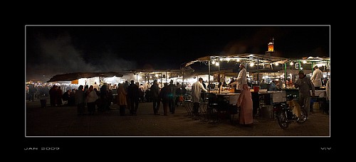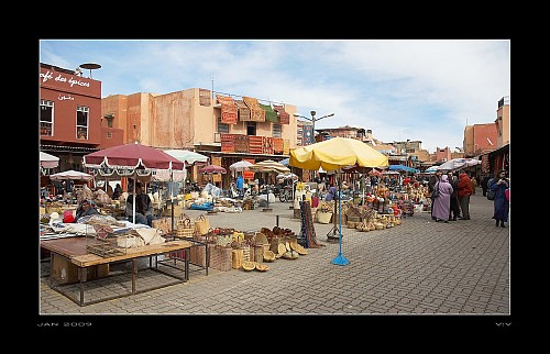 Ještě ten večer se přesouváme do Tinerhiru a odtud nočním busem do Marrakeche, kam přijíždíme nad ránem. Dobouchat se do smluveného hotýlku je trošku problém. Jsme neodbytní a tak nakonec kolem šesté ranní uléháme do spacáků. Probouzíme se před polednem a vyrážíme do víru obchůdků a krámků v místních pasážích. Nakupujeme suvenýry, obhlížíme památky a užíváme tepla, neboť již zítra večer budeme vystaveni čtyřicetistupňovému teplotnímu rozdílu – v Praze je totiž PATNÁCT pod nulou!!! Tak to můžeme v neděli jet na ledy.