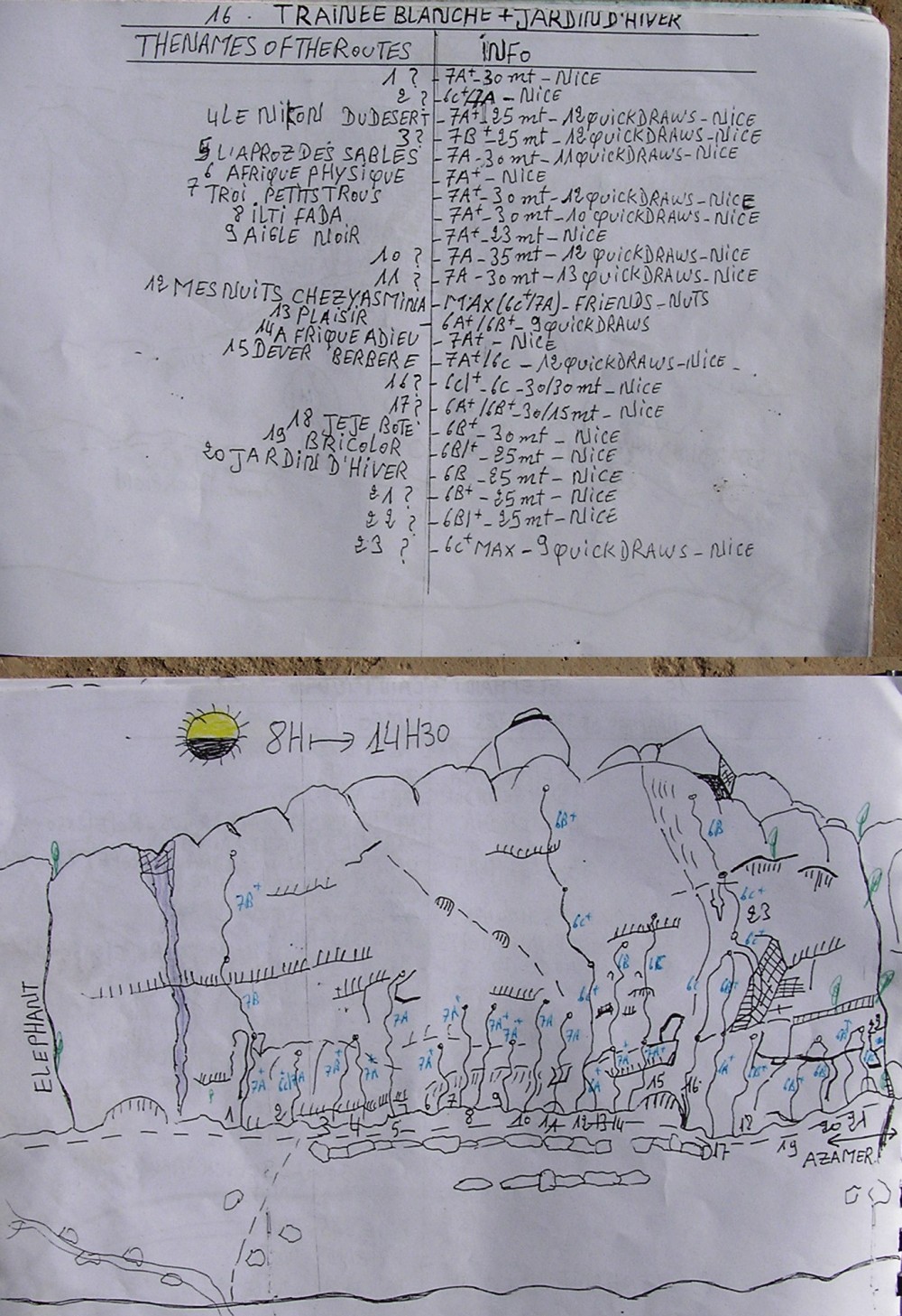 Na oblíbeném Elephantu jsme prostoupili, a to hned dvakrát, krásným převisem dvoudélkovými cestami Tajine and Omelette 5c, 6b+ a Two Frozen Chaps 6a, 6c. Obě cesty nám přišli jako logické linie, které se druhou délkou spojují v jednom štandu. Největší dřinou bylo však čištění skály, které vždy zabralo nejvíce času a neslo s sebou asi 300kg poshazovaných kamenů. Naštěstí se nám vždy z tohoto sektoru podařilo případné oběti padajících předmětů (někdy se s kamenem poroučel i klíč na utahování nebo matka s podložkou) odlákat. Prvopřelezy byly obtížnostně spíše adrenalinového charakteru – nikdy nevíš, co se kdy a kde ještě ulomí! Vše zůstalo na svých místech a tudíž jsme mohli cestou ze skal namalovat nové výstupy Hassanovi do notýsku (Hassan = postavička, kterou nepřehlédnete. Pohodový týpek, takový místní lezecký guru a něco jako správce skal. Kreslí průvodce, se všemi se kamarádí a občas tahá kurzisty po okolních skalkách).