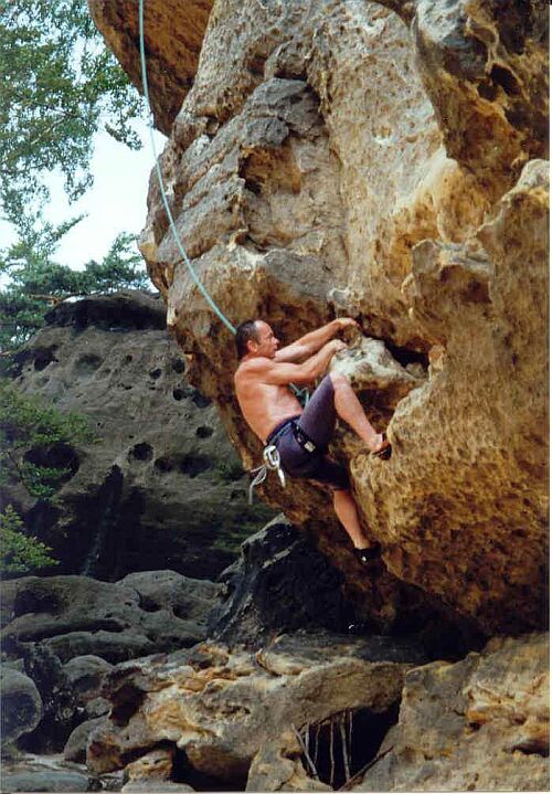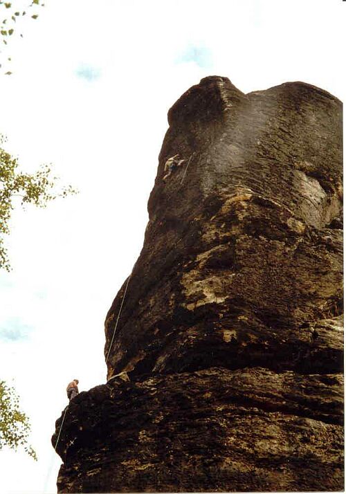 P.S.: JirkoSi, k Tvému dotazu. Odhaduji, že cest může být v Sasku přes 17 000. Z toho může být možná 20% těch, co stojí za přelezení. Zdaleka nemám přelezené všechny, které bych přelézt chtěl. A protože mám občas i zvrácenou chuť na nějakou odpudivou z těch zbylých 80%, nezbývá, než přísně vybírat. Myslím, že člověk zaměstnaný to tady všechno nemůže stihnout ani při všech víkendech, svátcích a dovolených, co jich vůbec má. Ono taky není jednoduché vylézt deset cest za den, protože v průběhu dne dochází k jisté duševní opotřebovanosti. Člověku se prostě nějak nechce prožívat perné chvilky až tolikrát najednou mezi jedním probuzením a usnutím. Dáš si jednu pořádnou stěnu, pěkně se vyklepeš, pak si dáš možná druhou a pak už vyklepán až do večera jen nějaké kvaky nebo spokojené nic. Nevím jestli to vysvětluji dost jasně, ale takhle nějak to působí na mě.