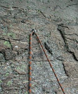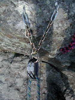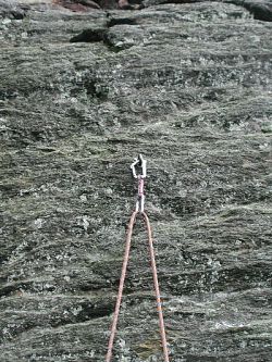 - Místo karabiny lze použít dvě protisměrně zapnuté expresky, zámky se nesmí dotýkat skály.