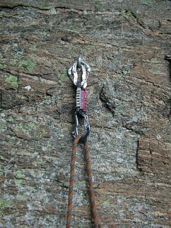 - Do borháku nebo nýtu je vhodné vložit dvě karabiny s pojistkou za sebou. Lano se méně dře o skálu než s  jednou karabinou. Naopak je-li vratným bodem kruh (leží na skále na plocho) je výhodnější pouze jedna karabina s pojistkou nebo dvě vedle sebe.
