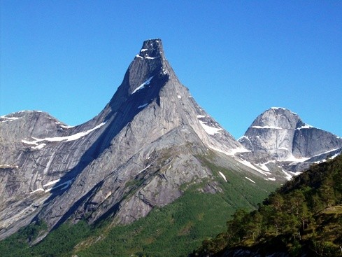Zkomolený kužel Stetind, gora narodowa. Norský Říp. Opravdickej kopec. Sněhu dostatek, ze severu mládeži nepřístupno. Z jihu slátanina pro teenagery, záplata na duši. Stačilo, Andělo.