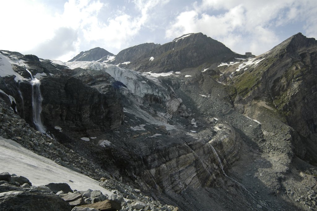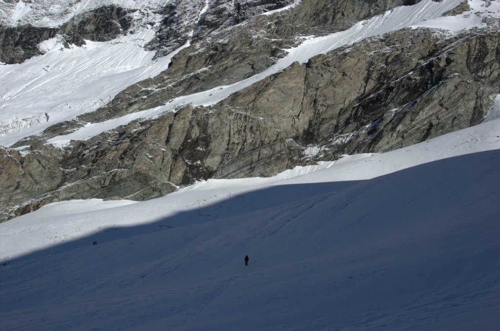 Na Domu nám nějak nepřálo počasí. Chatařka ráno (budíček ve 3:30?) říkala "bit windy", když jsem venku před chatou vařil snídani, tak to opravdu nebylo nic moc, ale podlehli jsme davové psychóze a šli jsme. Nejdřív po suti okolo českých stanů (chatař je moc nemusel, protože mu akorát chodí na chatu s odpadky, na záchod a ani pivo si nedají), potom kousek dolů na ledovec a nahoru po levém kraji ledovce co to jde až pod Festijoch. Je tam jeden chyták, zhruba v půlce cesty k Festijochu odbočuje doleva nahoru na hřeben pruh sněhu. Člověk by si skoro myslel, že tudy se jde na Festijoch, ale není to pravda. Už se spletlo víc lidí (Zdendovy cestopisy - Bishorn 2007).